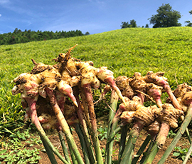 【应用效果】原来大姜地块土壤板结、次生盐渍化很重。现在冲施荧保素后,土壤疏松,无盐渍化迹象,适合大姜生长,并且长出了蘑菇。